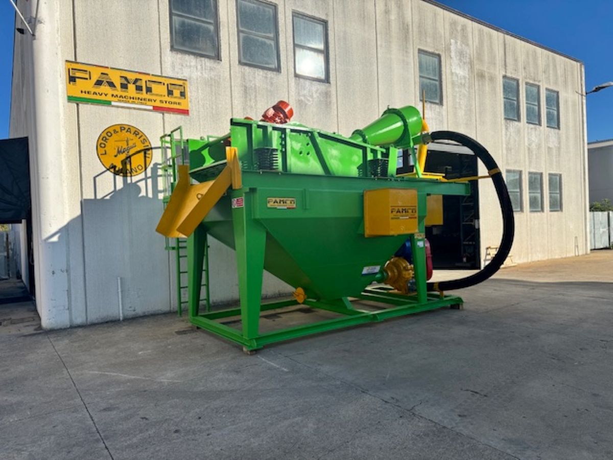 Gruppo di recupero sabbia con idrociclone marca OMF modello TSF 5000 revisionato a nuovo con pompa Warman originale 6/4 AH in ferrocromo come nuova, vaglio sgrondatore da 2750x1510 mm. con idrociclone da 650 rivestito in gomma come nuovo, motovibratori Italvibras da 2.2+2.2kW , pannelli in poliuretano come nuovi e motore elettrico da 37kW. Gruppo con capacità di trattamento di 5000 litri/min di torbida e produzione indicativa di 55 m3/h, dotato di libretto di istruzione e di certificazione CE.