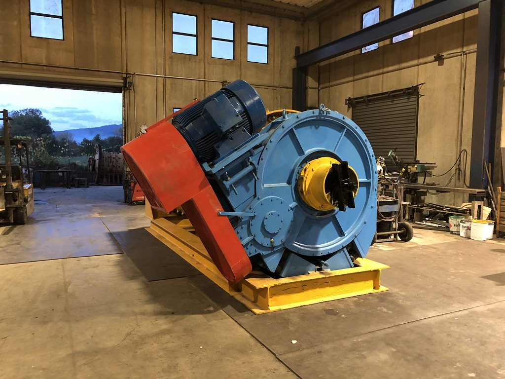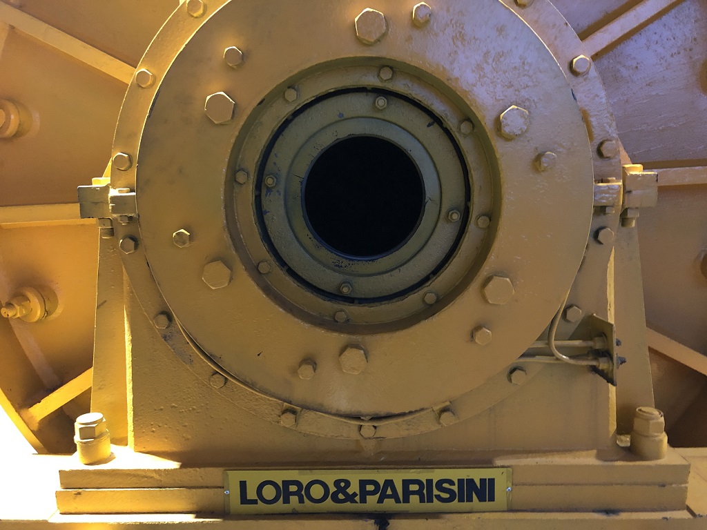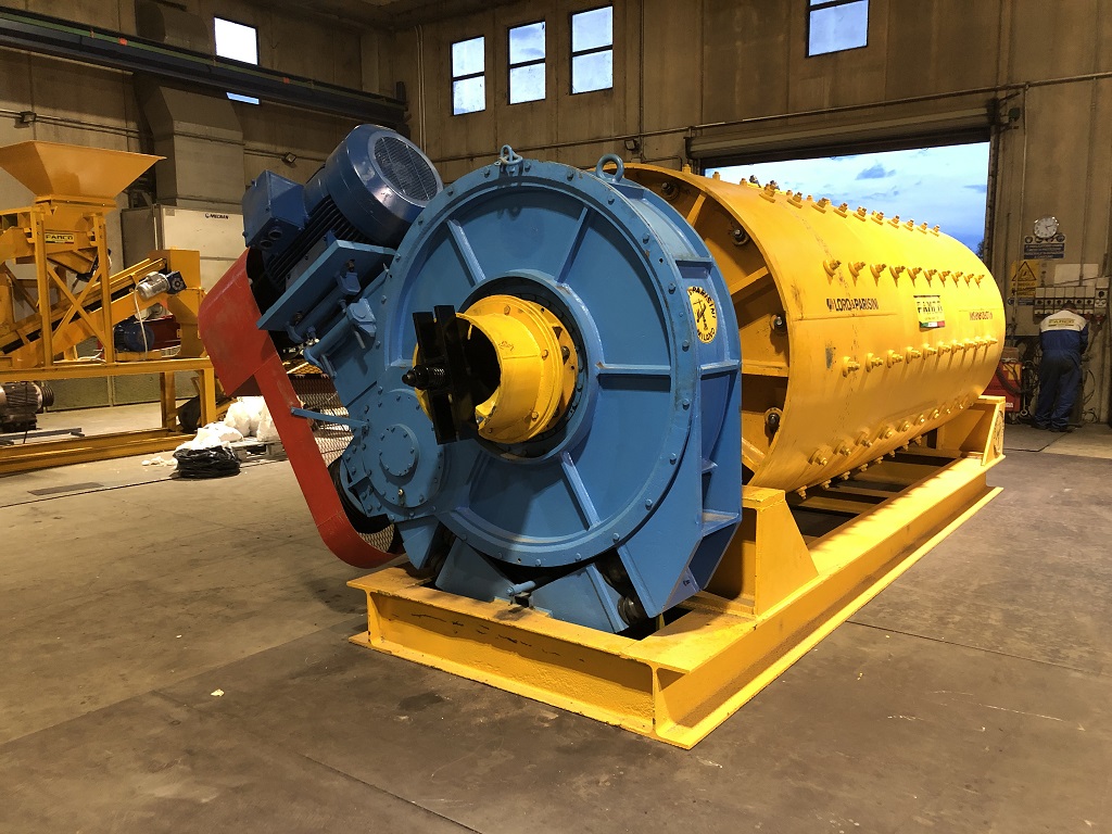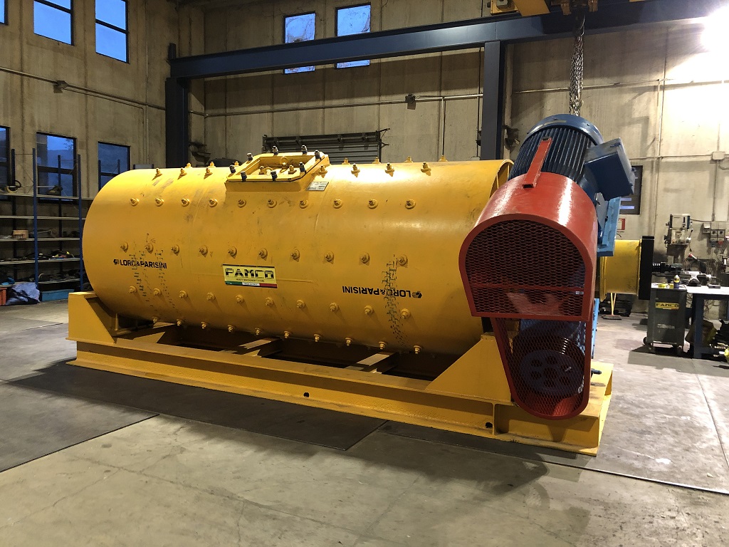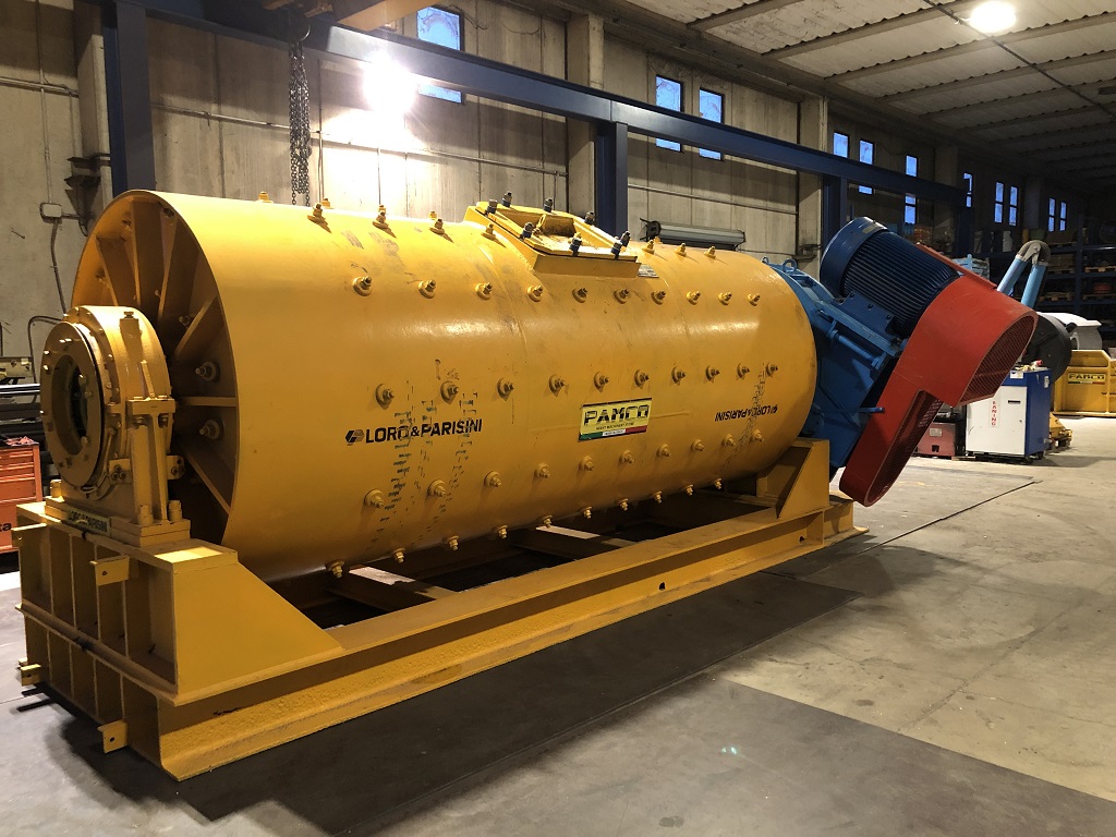Mulino a palle P1612 S.G.C.A. scarico con griglia e comando assiale su di telaio di appoggio di sezione HEB, con riduttore di comando rotazione di tipo assiale, motore elettrico Siemens da 132 kw con giunto idraulico e cinghie di trasmissione. Rivestimento interno in acciaio al manganese al 90%, griglia di scarico in acciaio al manganese nuova e protezioni a norme CE.