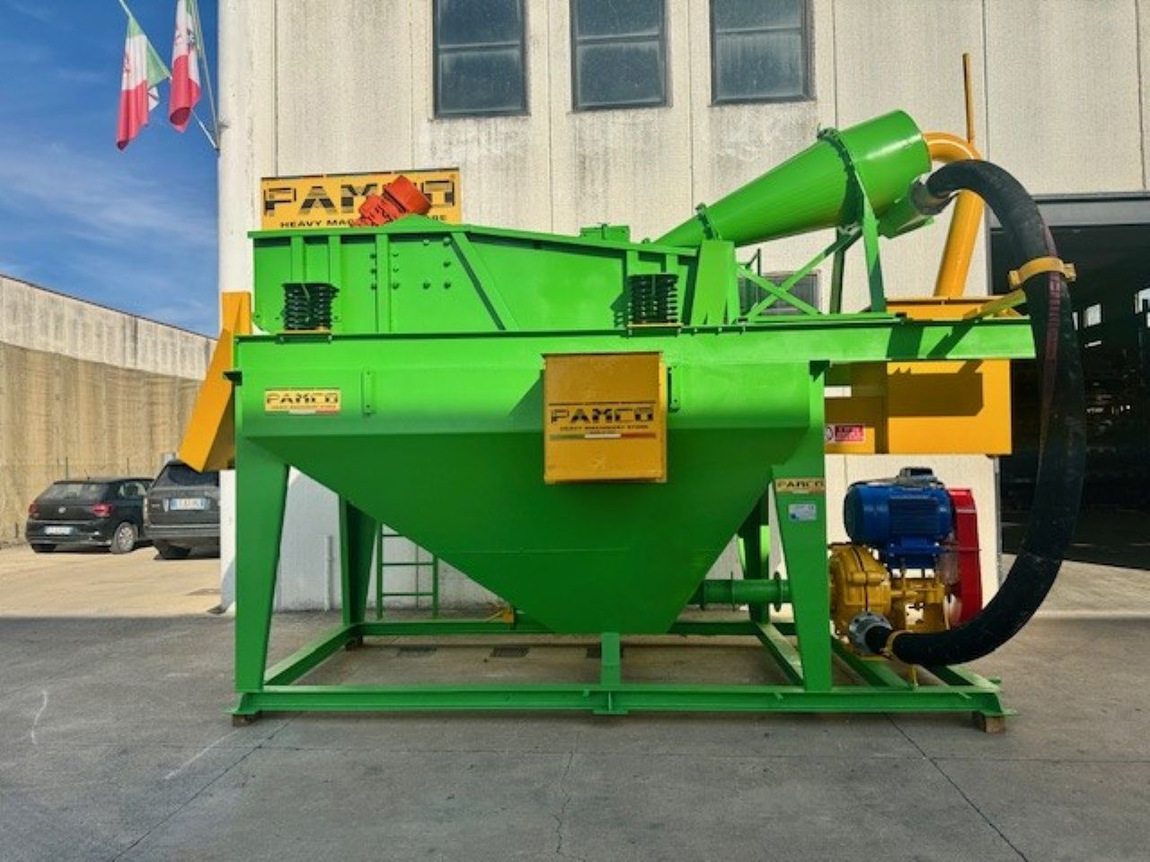 Gruppo di recupero sabbia con idrociclone marca OMF modello TSF 5000 revisionato a nuovo con pompa Warman originale 6/4 AH in ferrocromo come nuova, vaglio sgrondatore da 2750x1510 mm. con idrociclone da 650 rivestito in gomma come nuovo, motovibratori Italvibras da 2.2+2.2kW , pannelli in poliuretano come nuovi e motore elettrico da 37kW. Gruppo con capacità di trattamento di 5000 litri/min di torbida e produzione indicativa di 55 m3/h, dotato di libretto di istruzione e di certificazione CE.